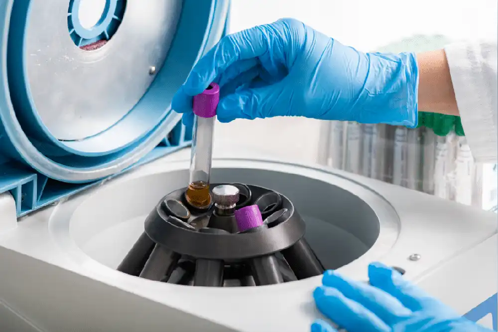 The blood is spun in a centrifuge machine to separate the platelet-rich plasma from red blood cells and other components.